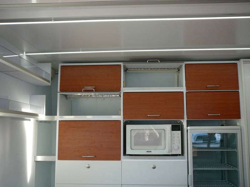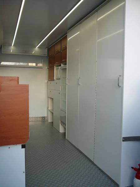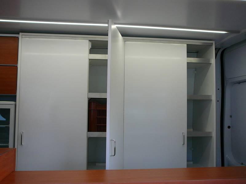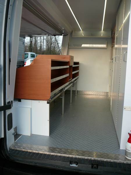 Doté de grands rangements coté passager, ces derniers ont été agencés d'après les recommandations du client. Ce dernier souhaitait une très grande zone de casiers pour le rangements des saucissons fermée par des portes battantes.