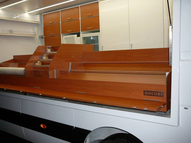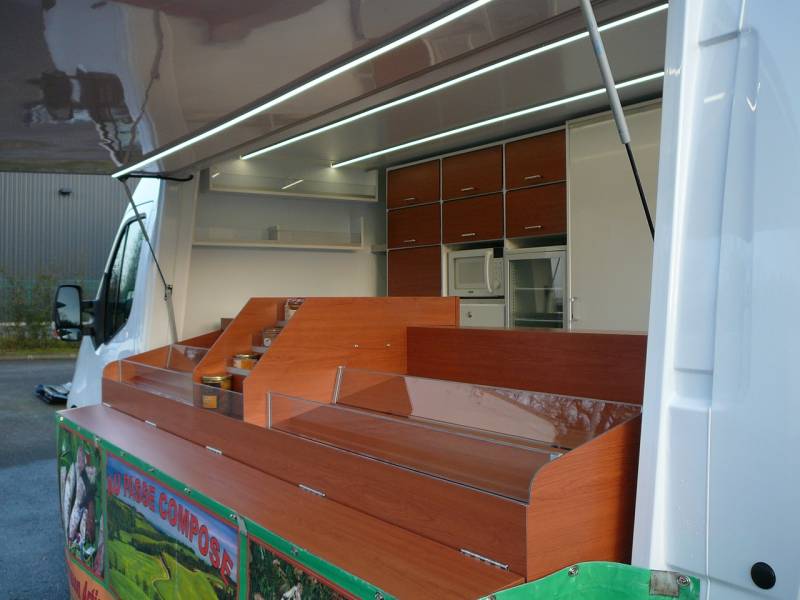 Après la découpe de la carrosserie en latéral pour la fabrication d'un volet. Nous avons fabriqué un étal coulissant sur-mesure avec rangement pour corbeilles de saucissons. Cette dernière regorge de rangement coté intérieur afin d'y inclure le tiroir caisse.